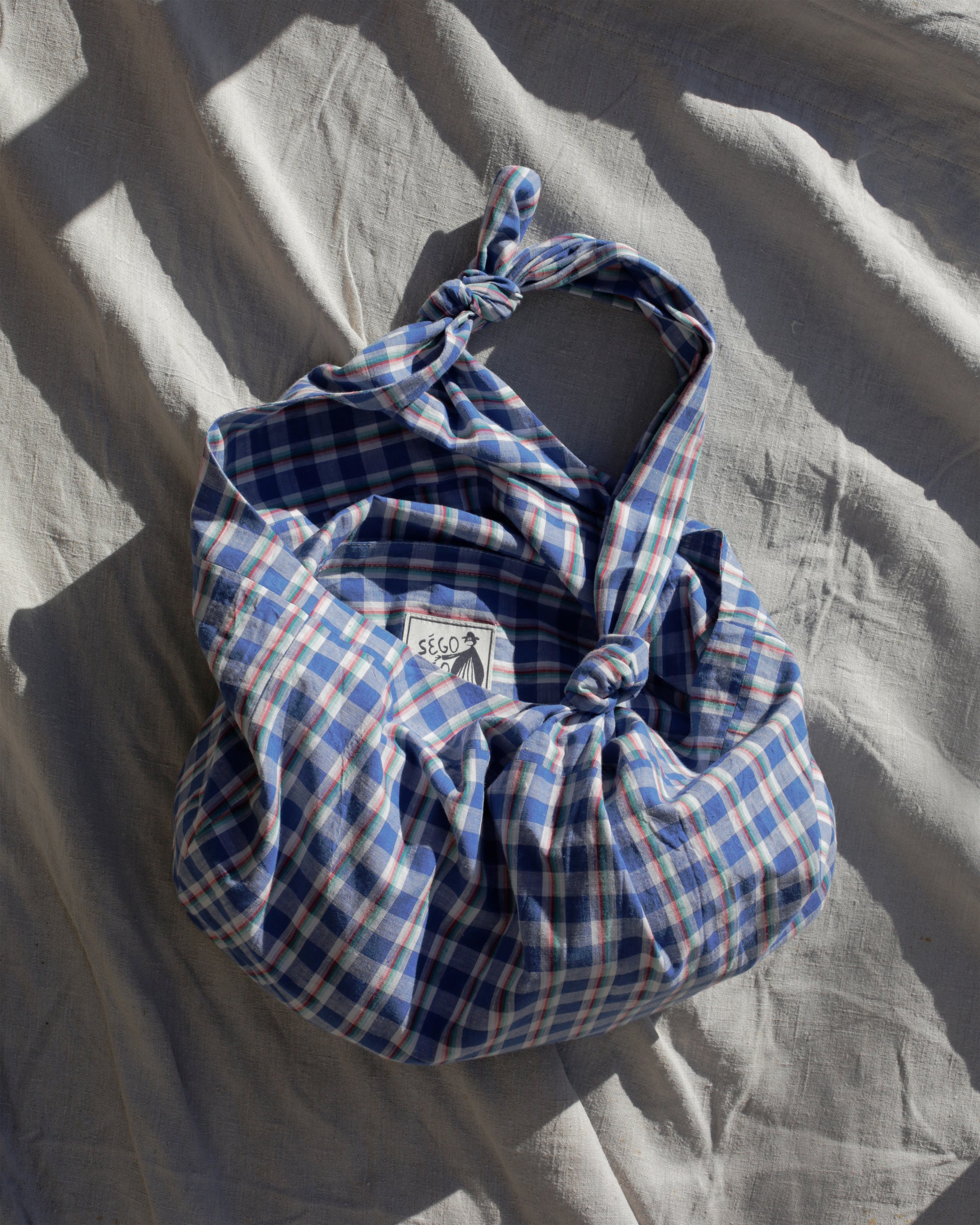 The baluchon bag is inspired by the traditional way of carrying goods in a square of fabric, often tied in the four corners. The market version is a bigger tote style bag with an interior pocket, surprisingly spacious with knotted handle that can be carried, worn on the shoulder, or across body.