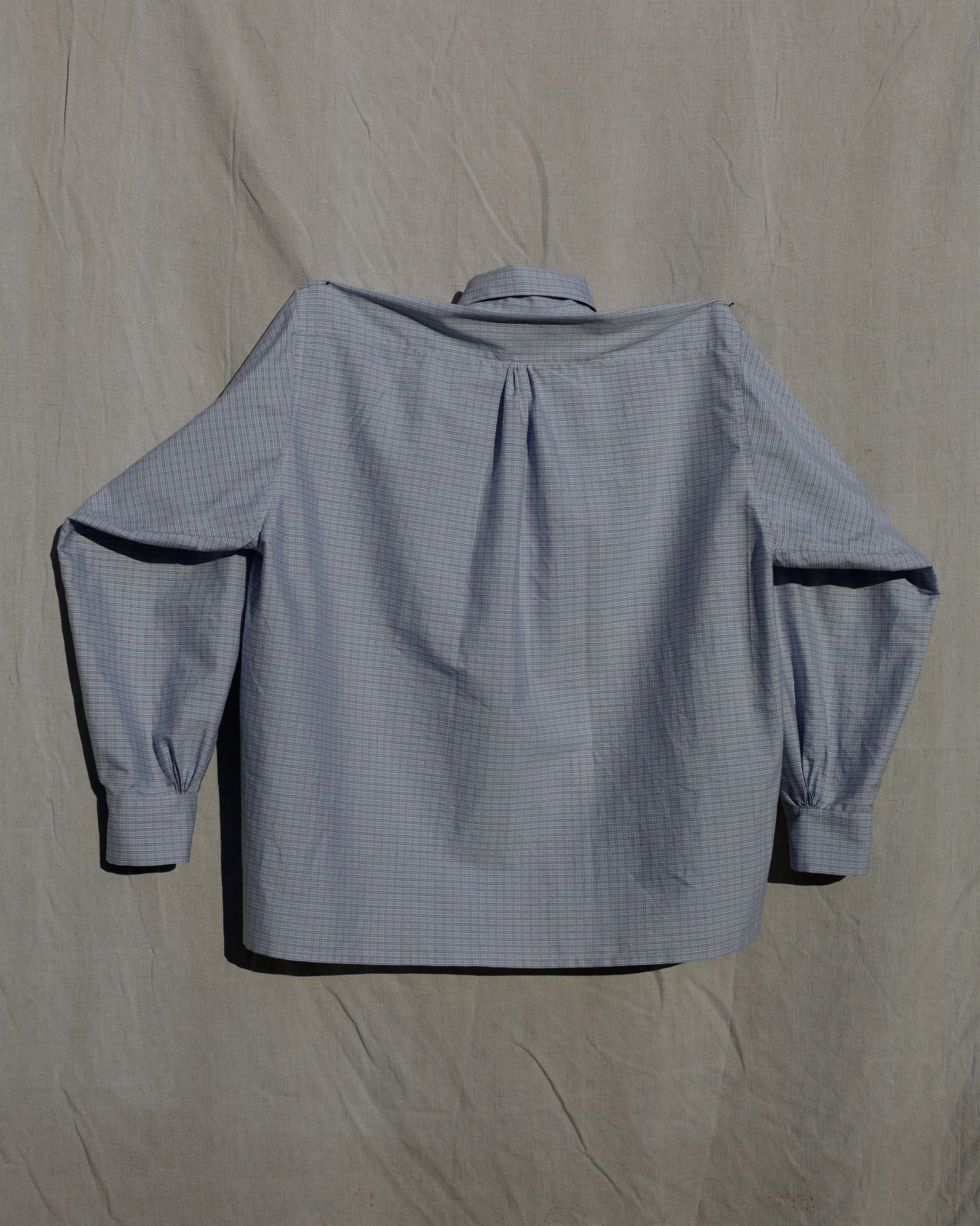 Inspired by walks in the mountains with the herd and a preference for working in button up shirts. Made from a lightweight French vintage cotton woven in a fine blue and white check. The style is an oversized boxy cut with gathered details in the back and sleeves, designed to be loose in the body and to be worn on both warmer and cooler days.