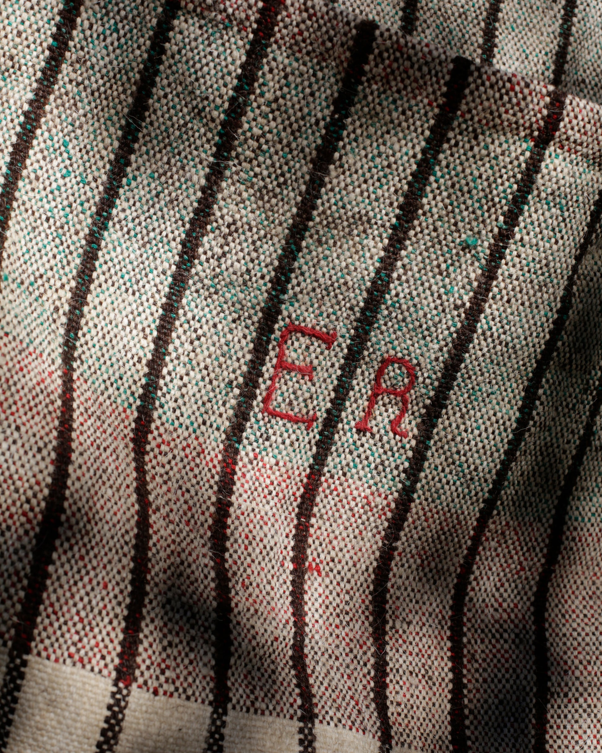 An antique heavy woven wool saddle bag with hand overlocked edges and hand embroidered initials, E.R. The wool is possibly mixed with hemp due to its weight and hand feel. Originating from Salamanca in Spain these pieces are believed to have belonged to a cow herder and would have been hung over the back of the horse behind the saddle to carry supplies. This piece is made from a continuous piece of fabric assembled to create two pouches, one at either end.