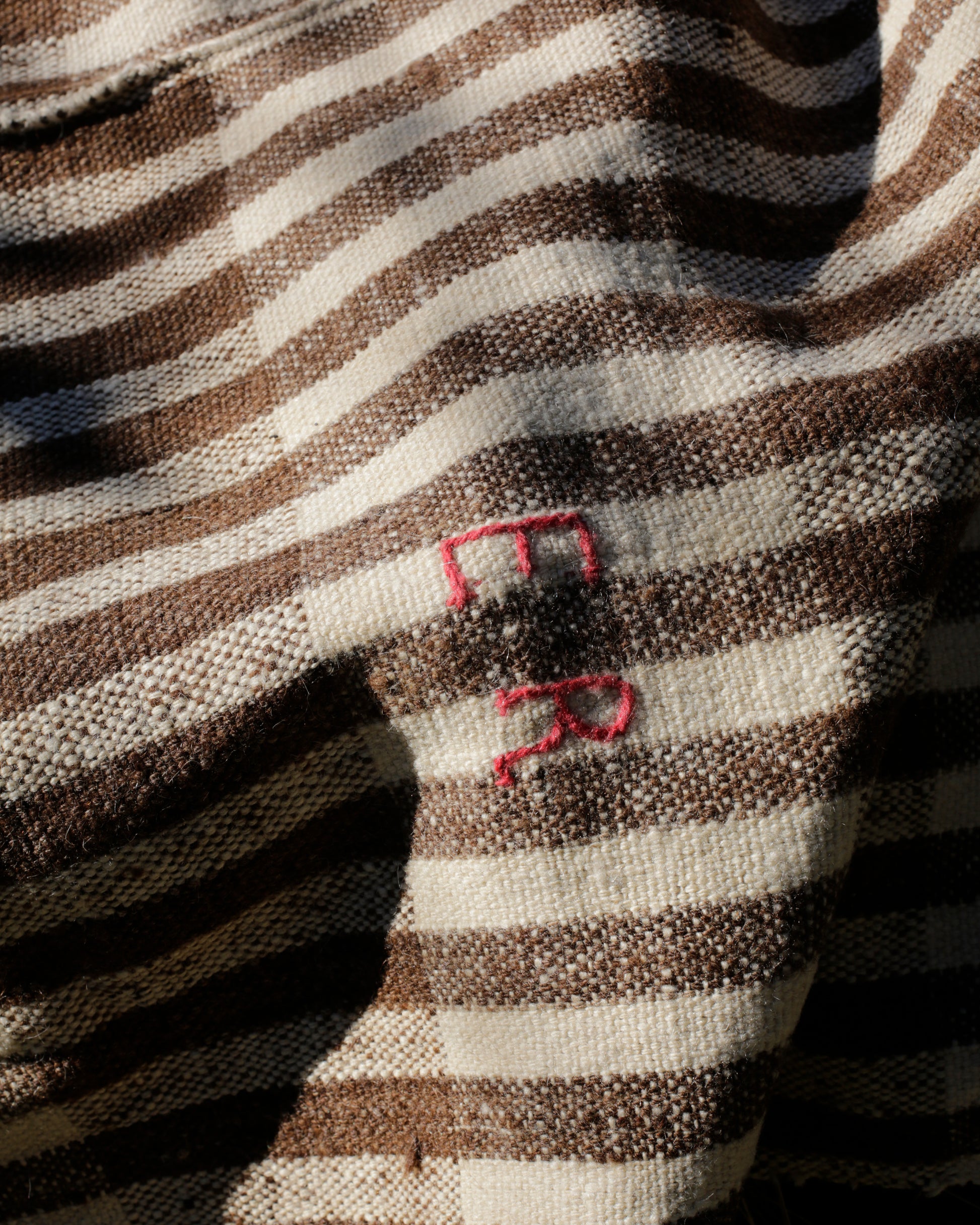 An antique heavy woven wool blanket with hand hemmed edges and overlocked central join. Possibly mixed with hemp due to its weight and hand feel. Originating from Salamanca in Spain these pieces are believed to have belonged to a cow herder and would have been used as a surface to sleep or to cover the body in bad weather conditions. This blanket has the owners initials, E.R, hand embroidered and a small repair also made by hand.