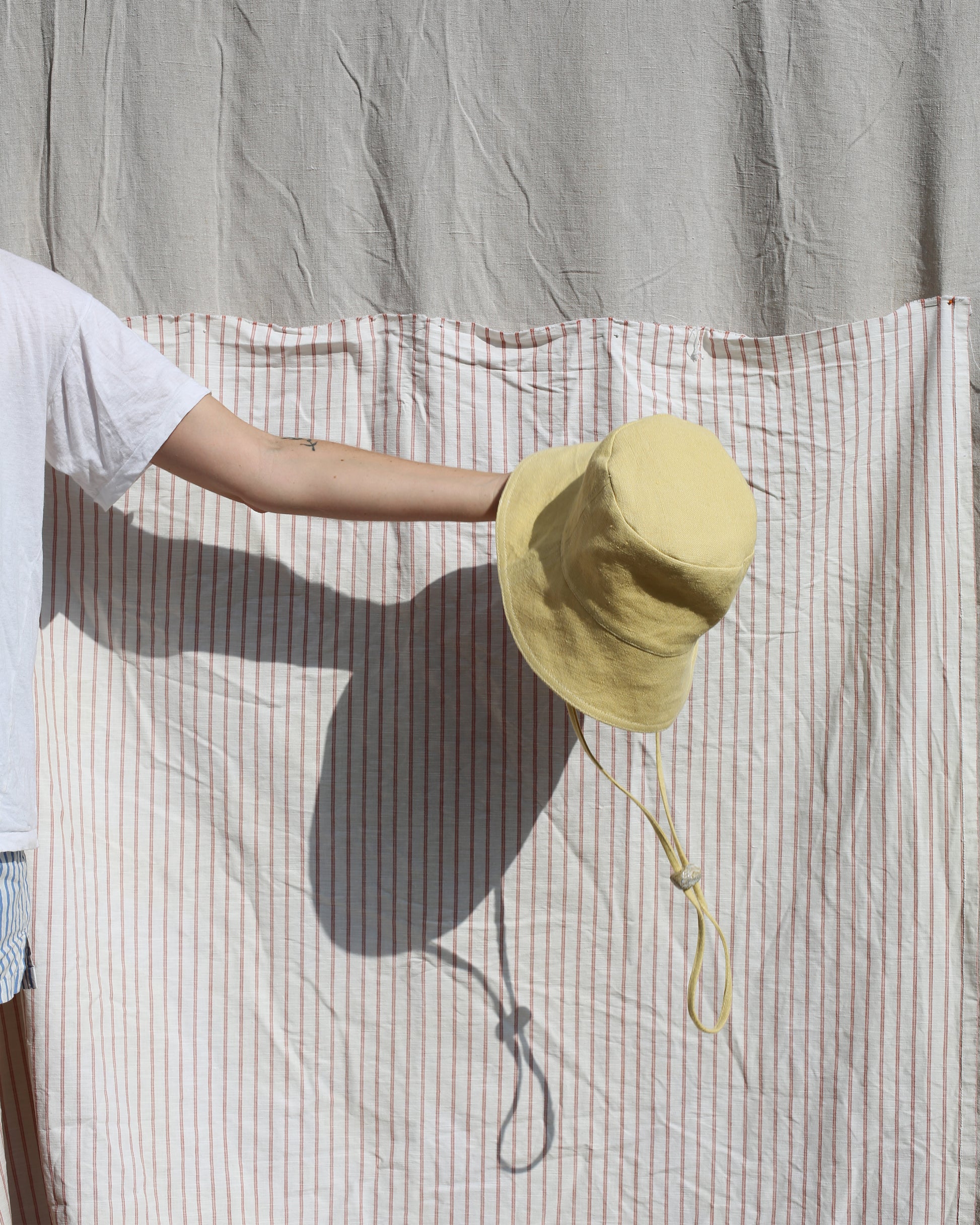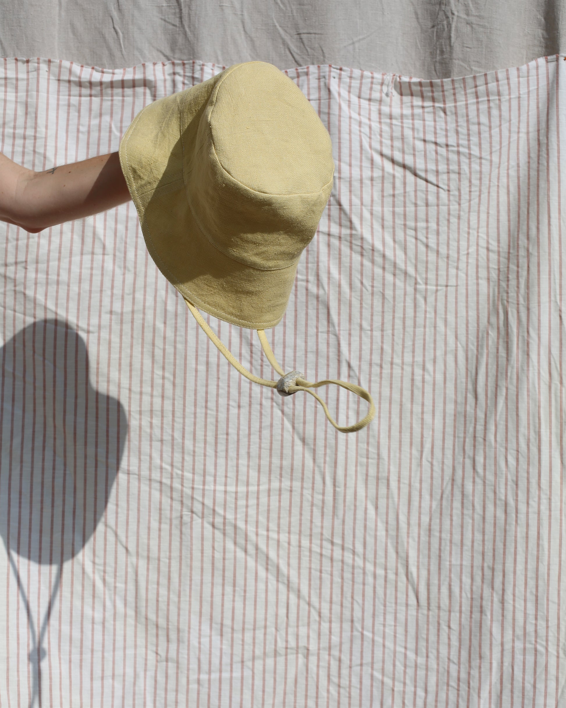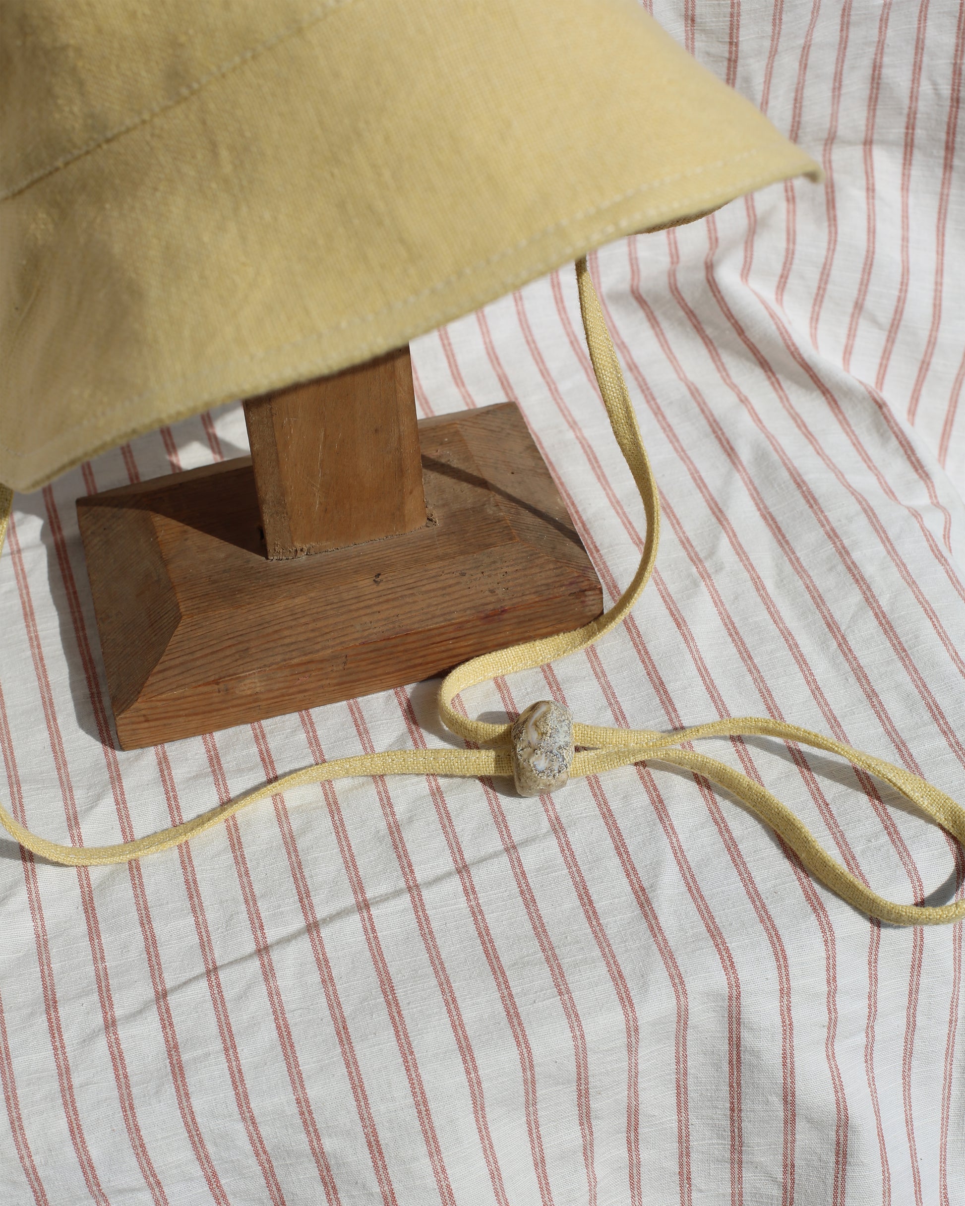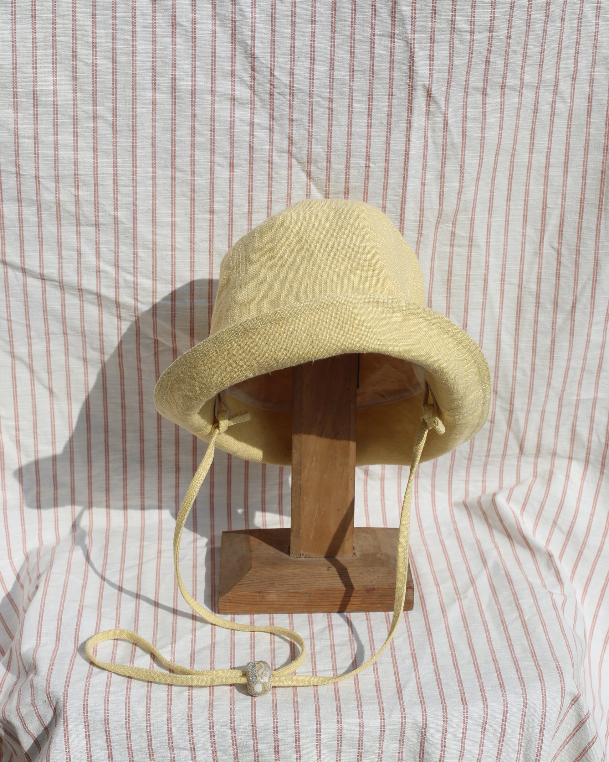 Bucket hat made from antique butter yellow tea towel linen, sourced in France. This is the last of the series, available in size M.