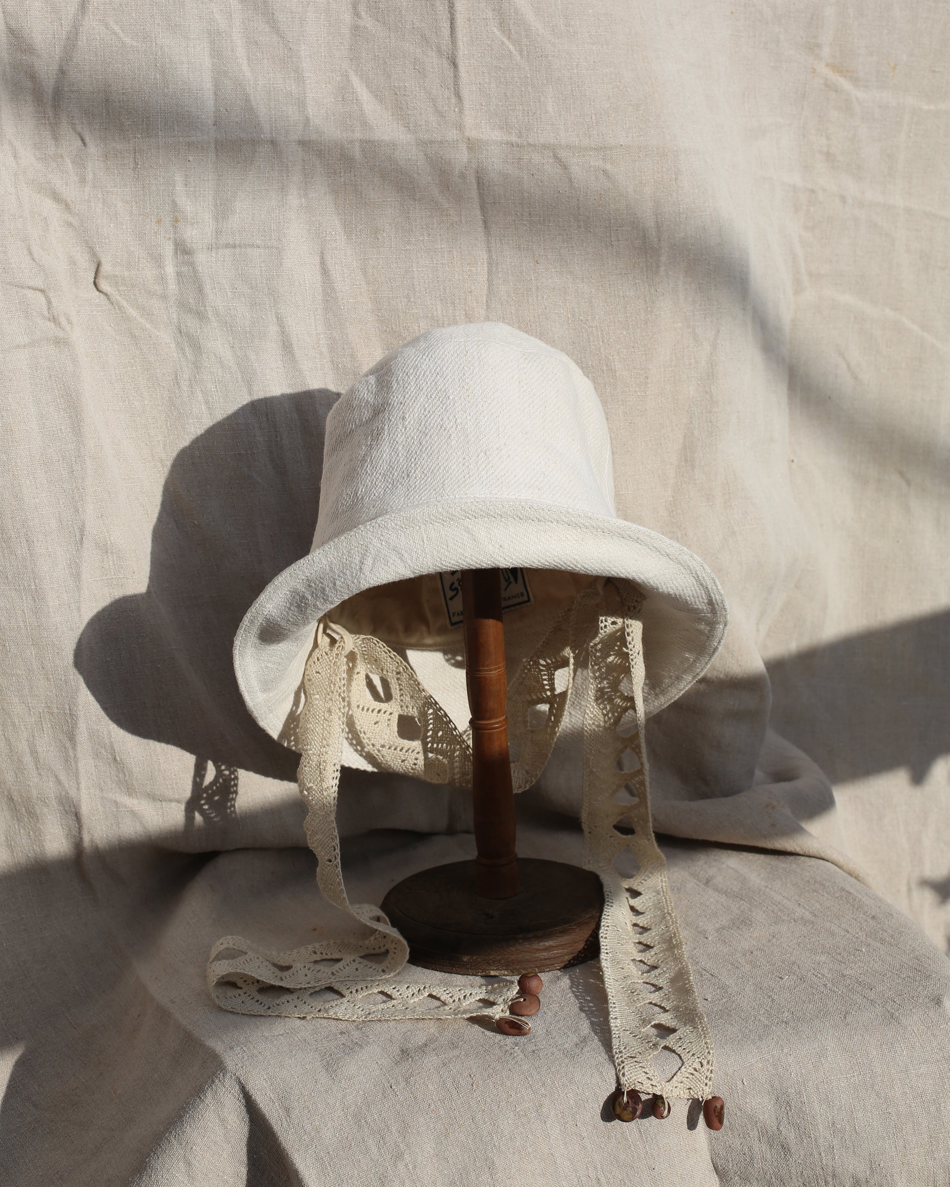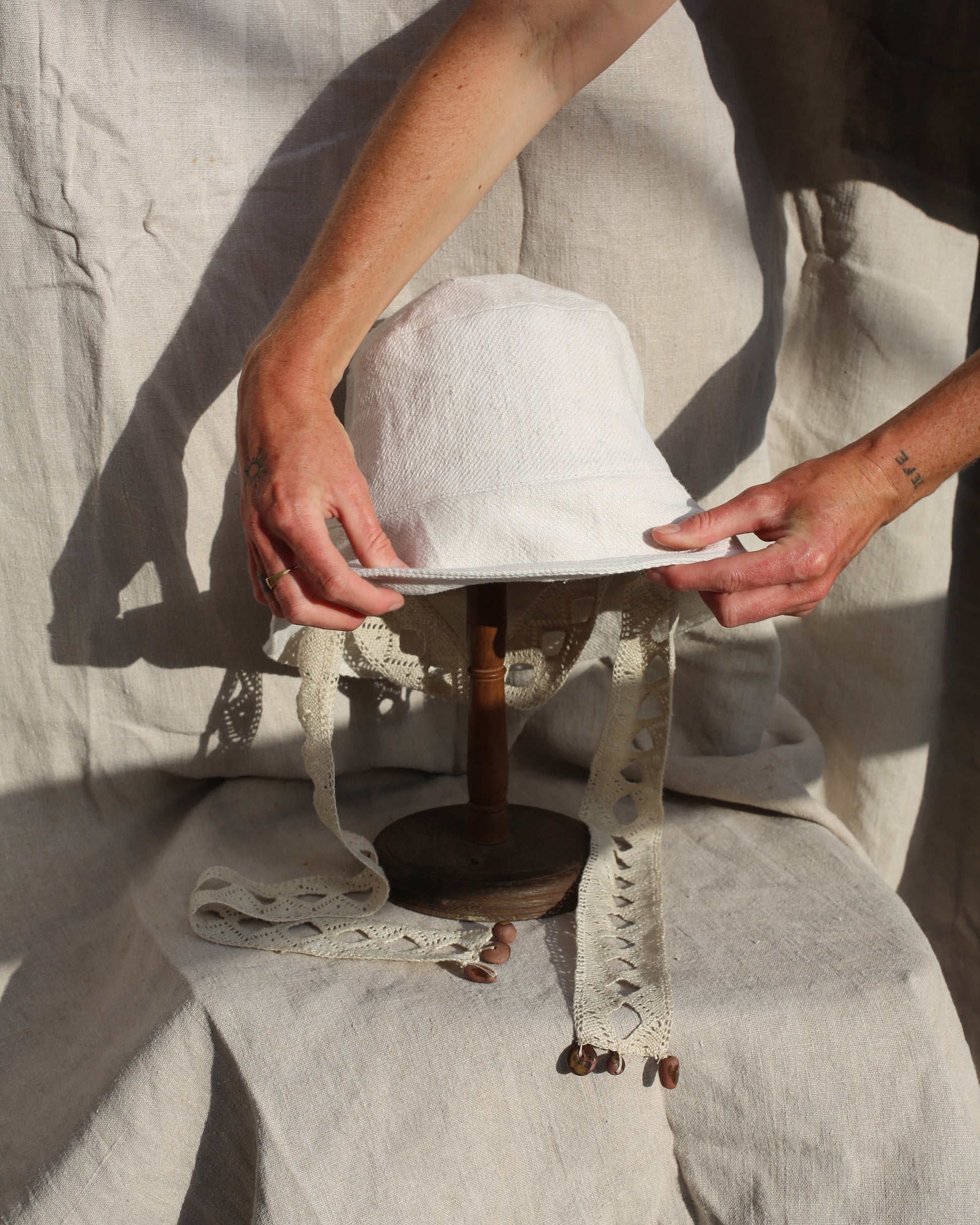 Bucket hat made from an antique linen tea towel, sourced in France. A mid to heavy weight fabric that softens over time. Lined with antique raw undyed linen, also sourced in France.