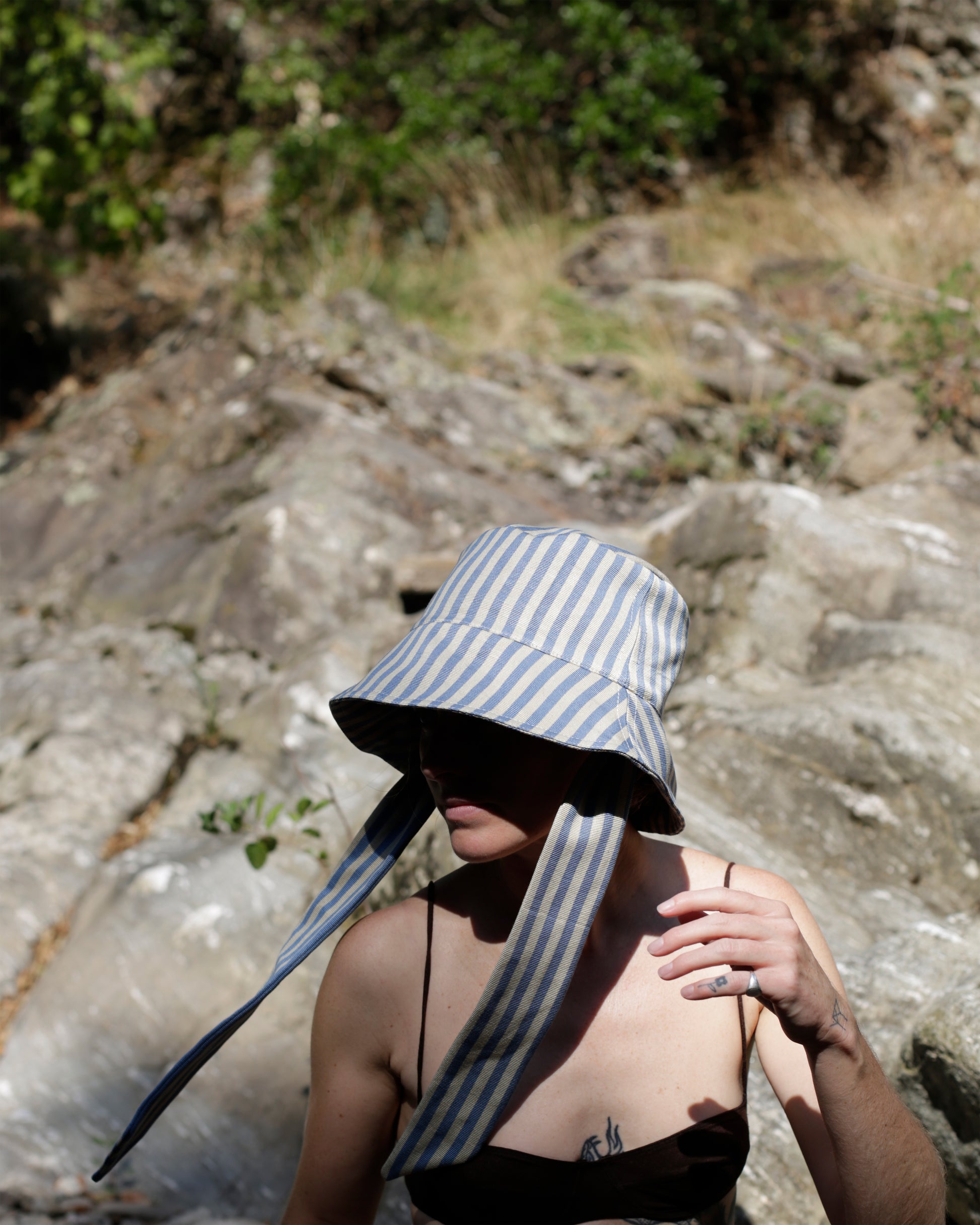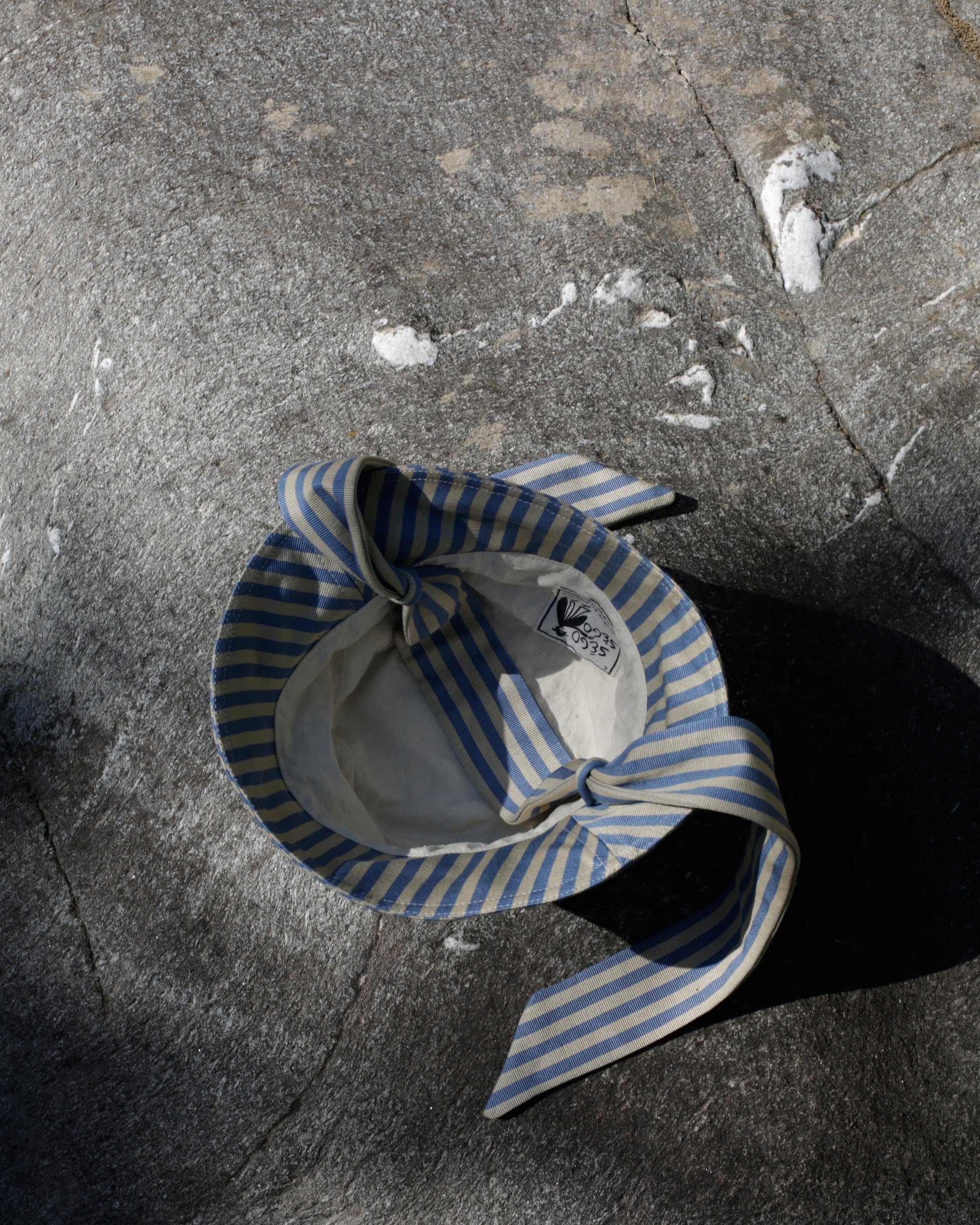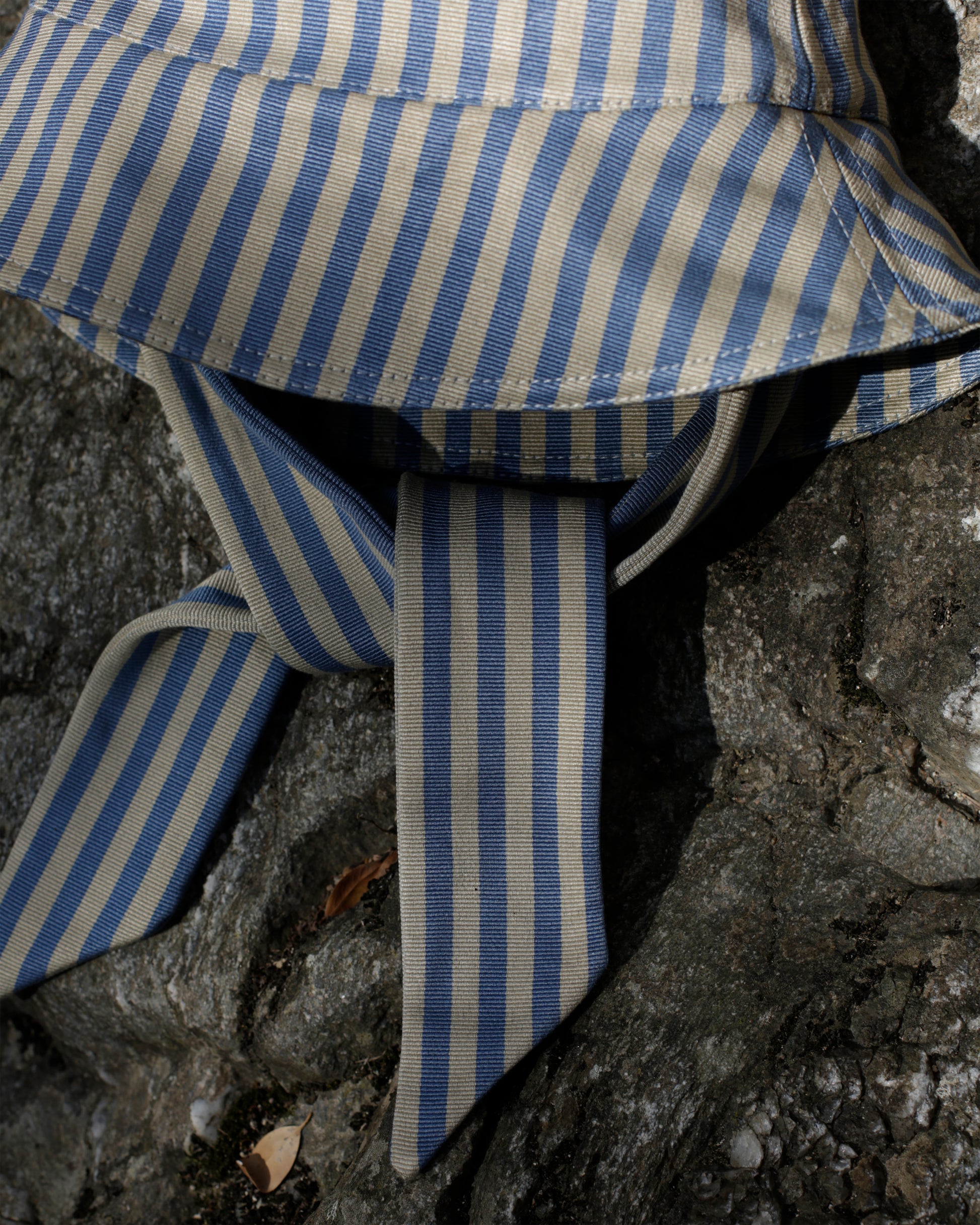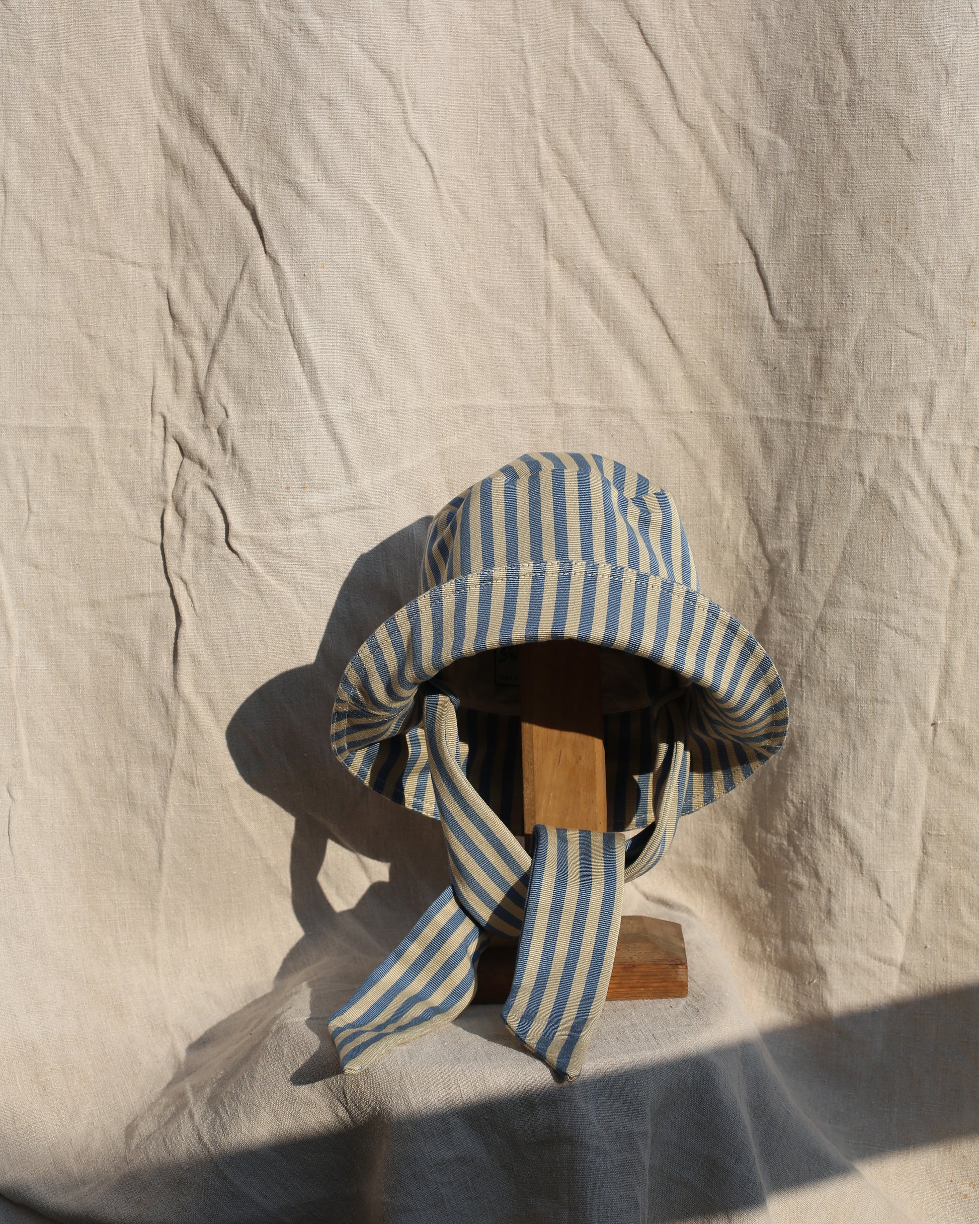 Bucket hat made from second hand heavy grossgrain cotton, sourced in India from the previous owner for a film set a fair few years ago. The fabric was kept in storage since and is ready to live its new life. The fabric is soft, but with a good weight allowing the brim to easily be folded up. It has a very slight lustre, between matte and slightly satinated and is woven with a sandy beige and muted blue stripe.