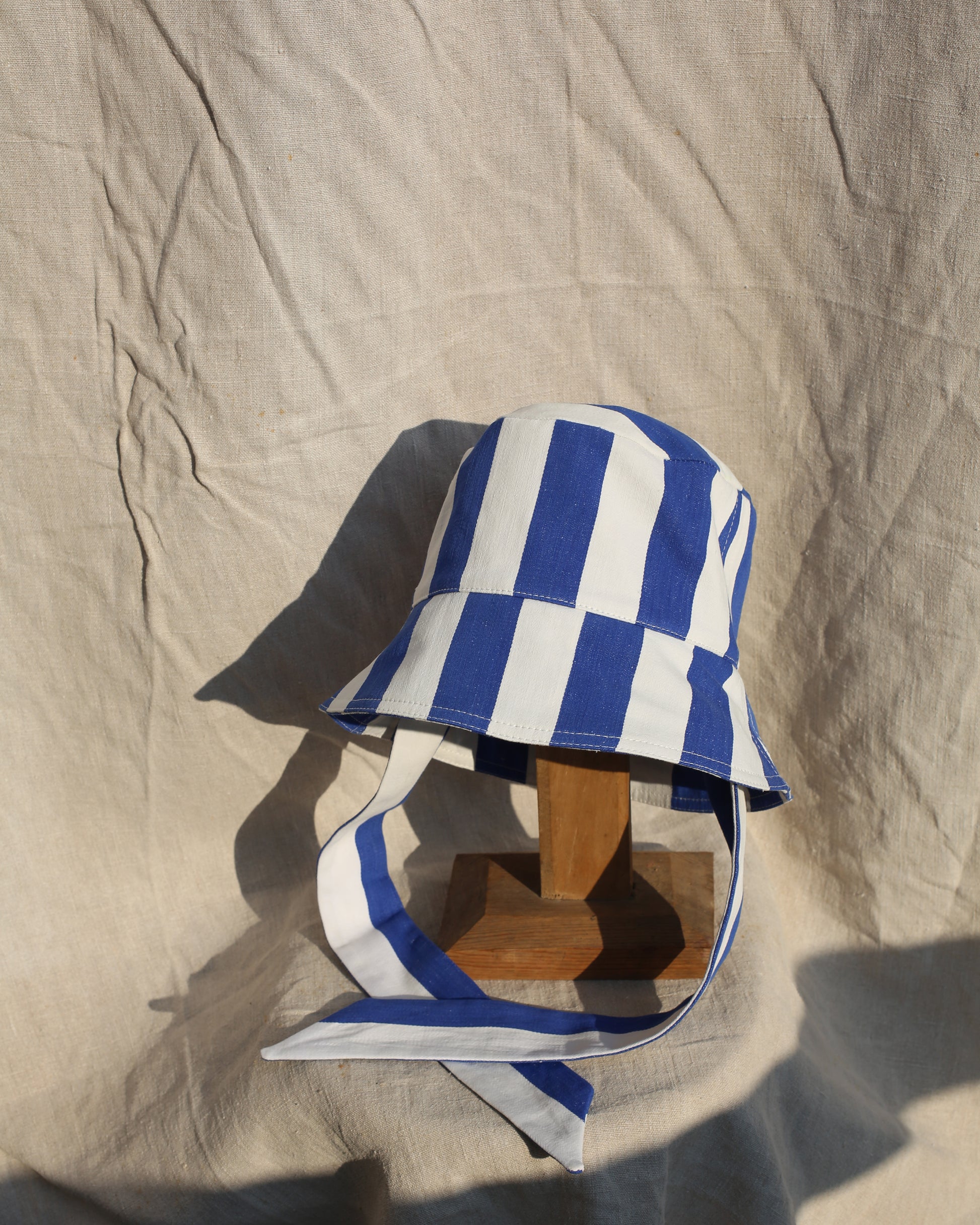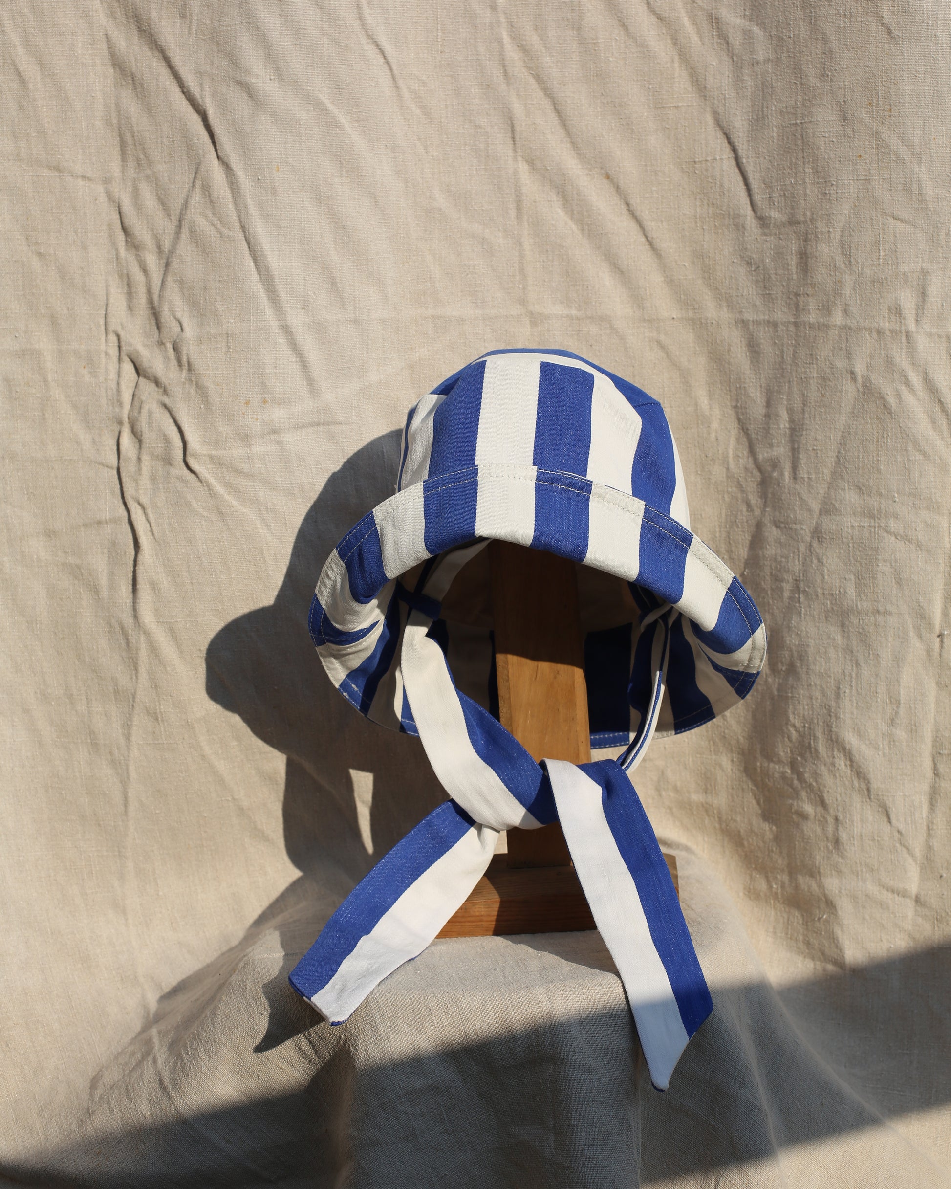 Bucket hat made from antique cotton mattress toile, sourced in Igualada in Spain. A soft mid weight cotton that allows for the brim to be easily folded up and stay in place. It has a white and blue woven stripe reminiscent of beach cabins and the inside of the hat is lined in antique undyed French linen.