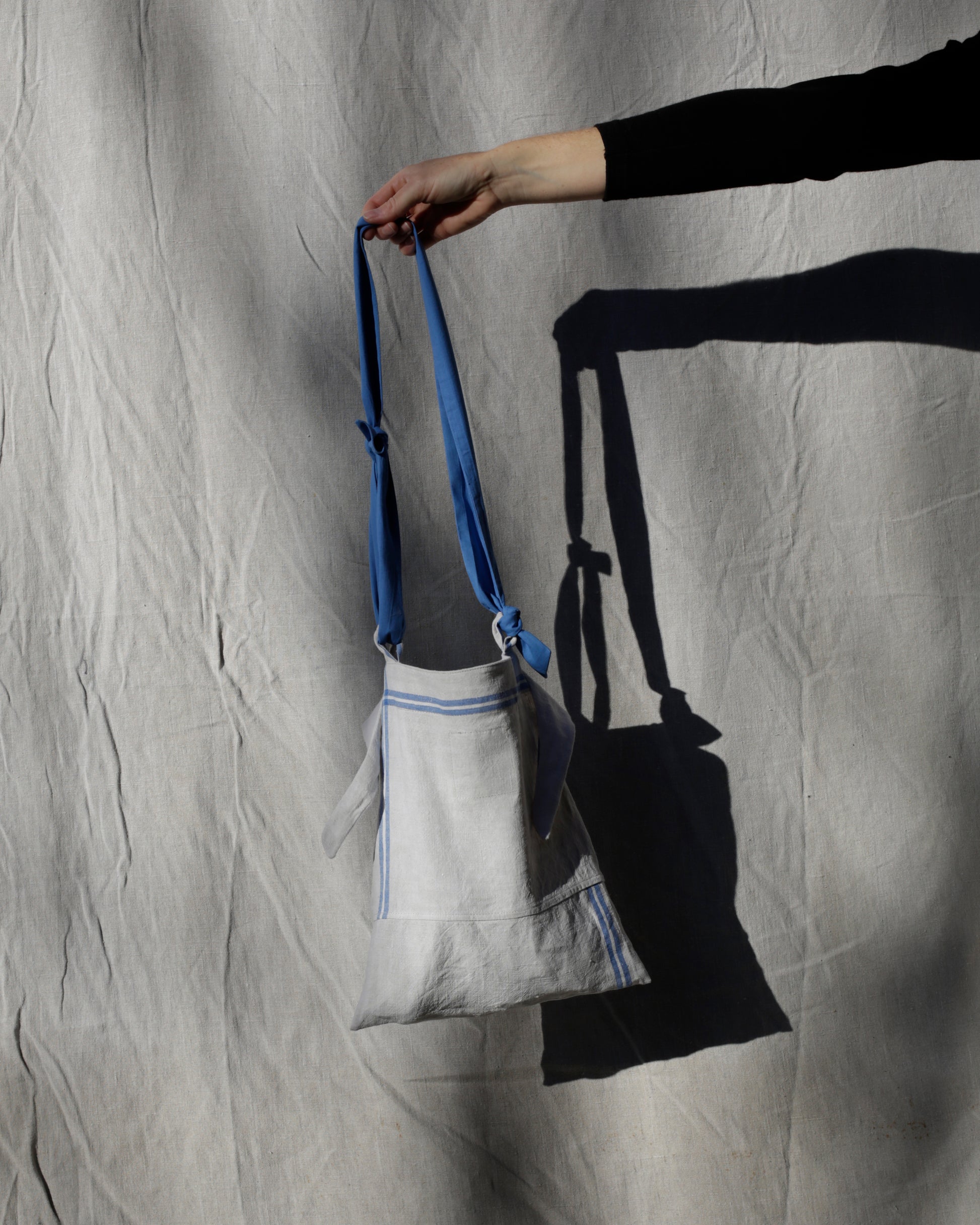 Made in antique greige linen with a blue stripe. The pieces are patched together using the same method as Korean Jogakbo patchworks, so that the joins are strong and there are no loose seam edges on the backside of the fabric.