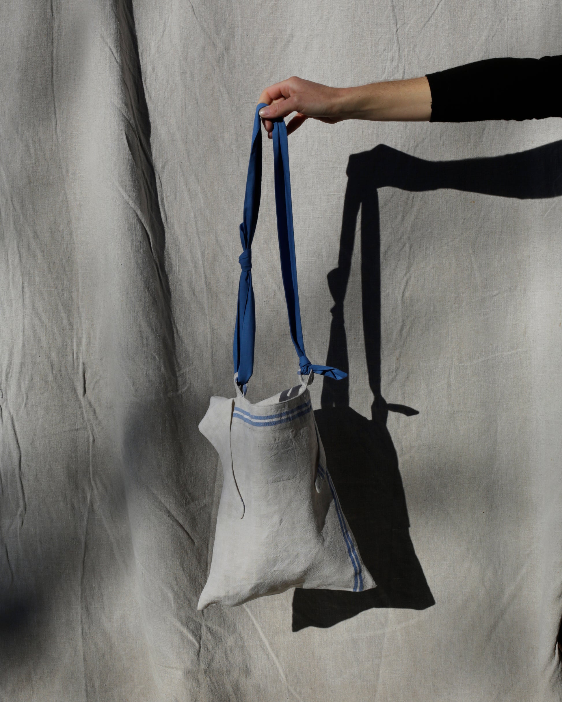 In a tote style, with an extended side to fold over and tie. The process of pulling these top tab straps around closes the bag in a roll top. The shoulder strap is made from old repurposed cotton, knotted with a sliding knot so this can be made longer or shorter, as you want. Can be worn on the shoulder or across body.