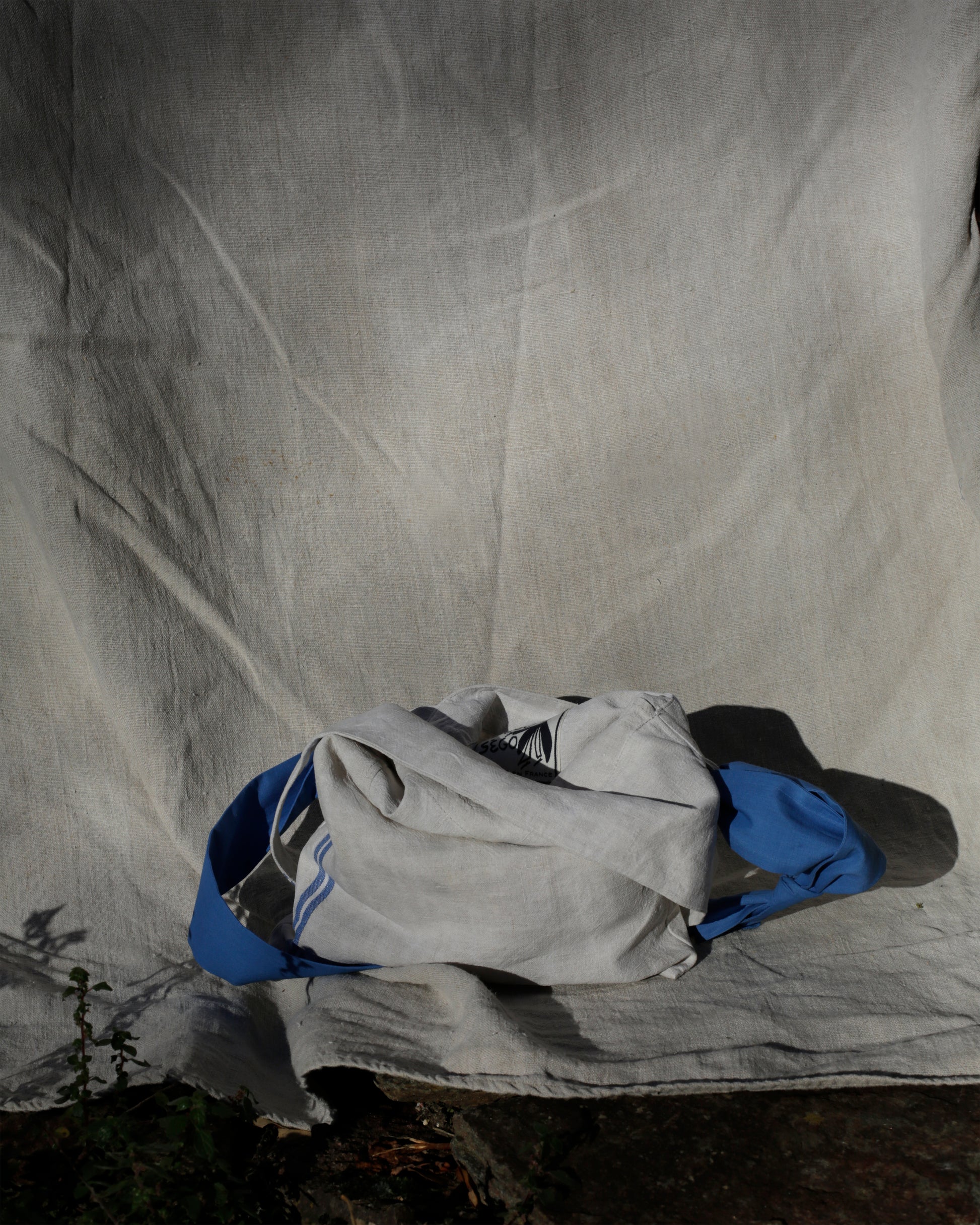 Made in antique greige linen with a blue stripe. The pieces are patched together using the same method as Korean Jogakbo patchworks, so that the joins are strong and there are no loose seam edges on the backside of the fabric.