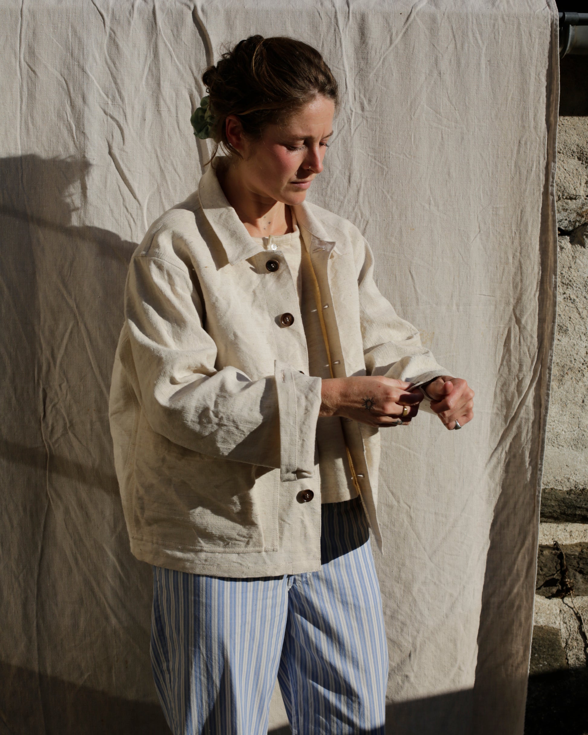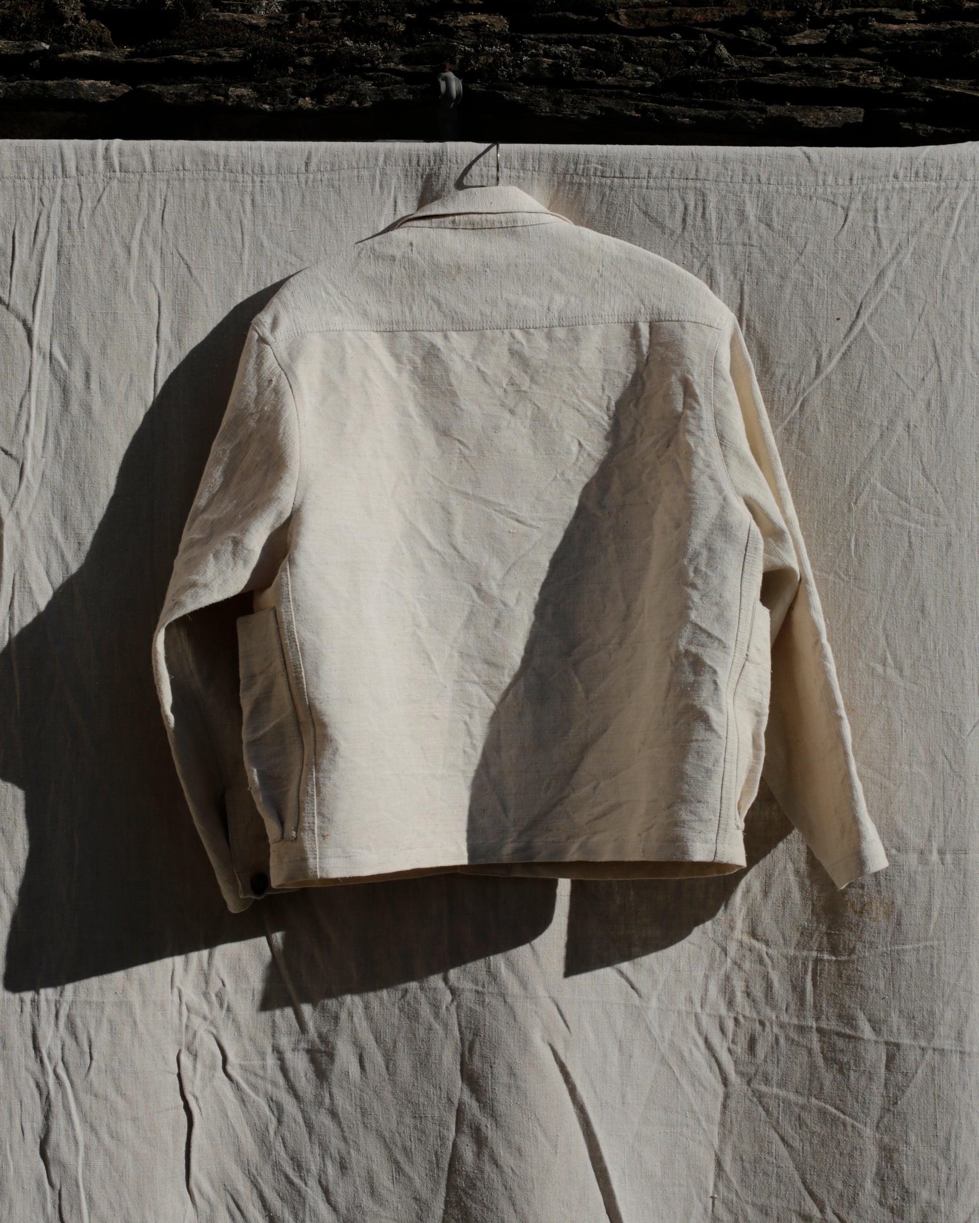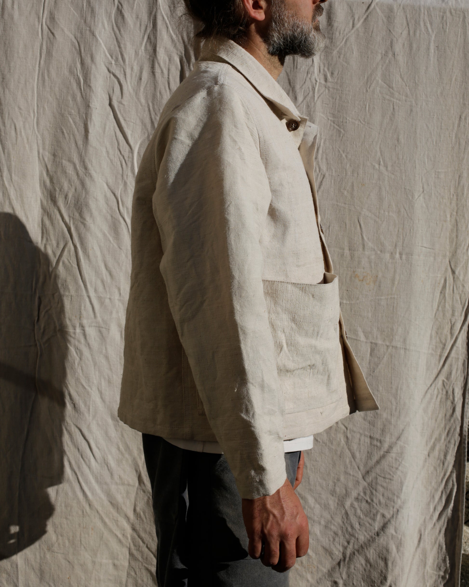 Sacoche jacket made from an antique métis of linen and hemp. It features two large pockets with pleat detail to allow for extra room when foraging mushrooms and chestnuts, and an internal pocket to keep the rest separate and secure. The fabric is raw and undyed, with some unprocessed fibres of the plant still visible in the weave. Hemp and the paysan have been connected for a long time due to it being a versatile natural fabric also well known for its durability. It is a fabric i really admire and like to collect at all available opportunities.